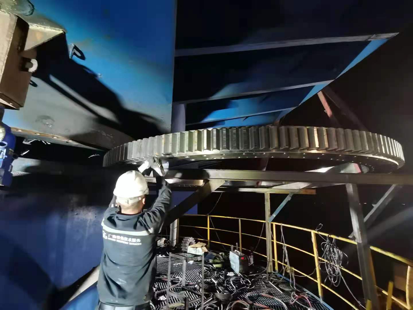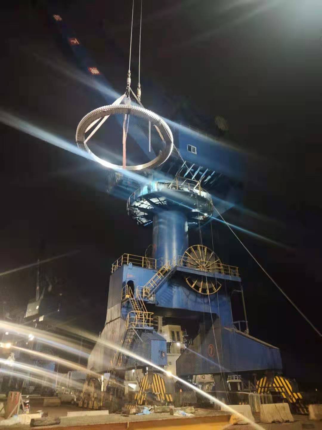 近日,廣鑫設(shè)備技術(shù)服務(wù)受福州松下港客戶委托,承接7#門座式起重機(jī)旋轉(zhuǎn)大軸承更換項(xiàng)目。該門座起重機(jī)已使用多年,旋轉(zhuǎn)軸承齒磨損嚴(yán)重,已處于故障停機(jī)狀態(tài)。為解決客戶燃眉之急,同時(shí)也考慮到施工的經(jīng)濟(jì)性和便捷性。經(jīng)我司技術(shù)人員充分溝通認(rèn)證,結(jié)合當(dāng)?shù)靥鞖馓攸c(diǎn),制定詳細(xì)維修方案:帶保險(xiǎn)裝置的頂升更換操作法,重新排裝回轉(zhuǎn)大軸承齒圈與齒輪的技術(shù)細(xì)節(jié)。