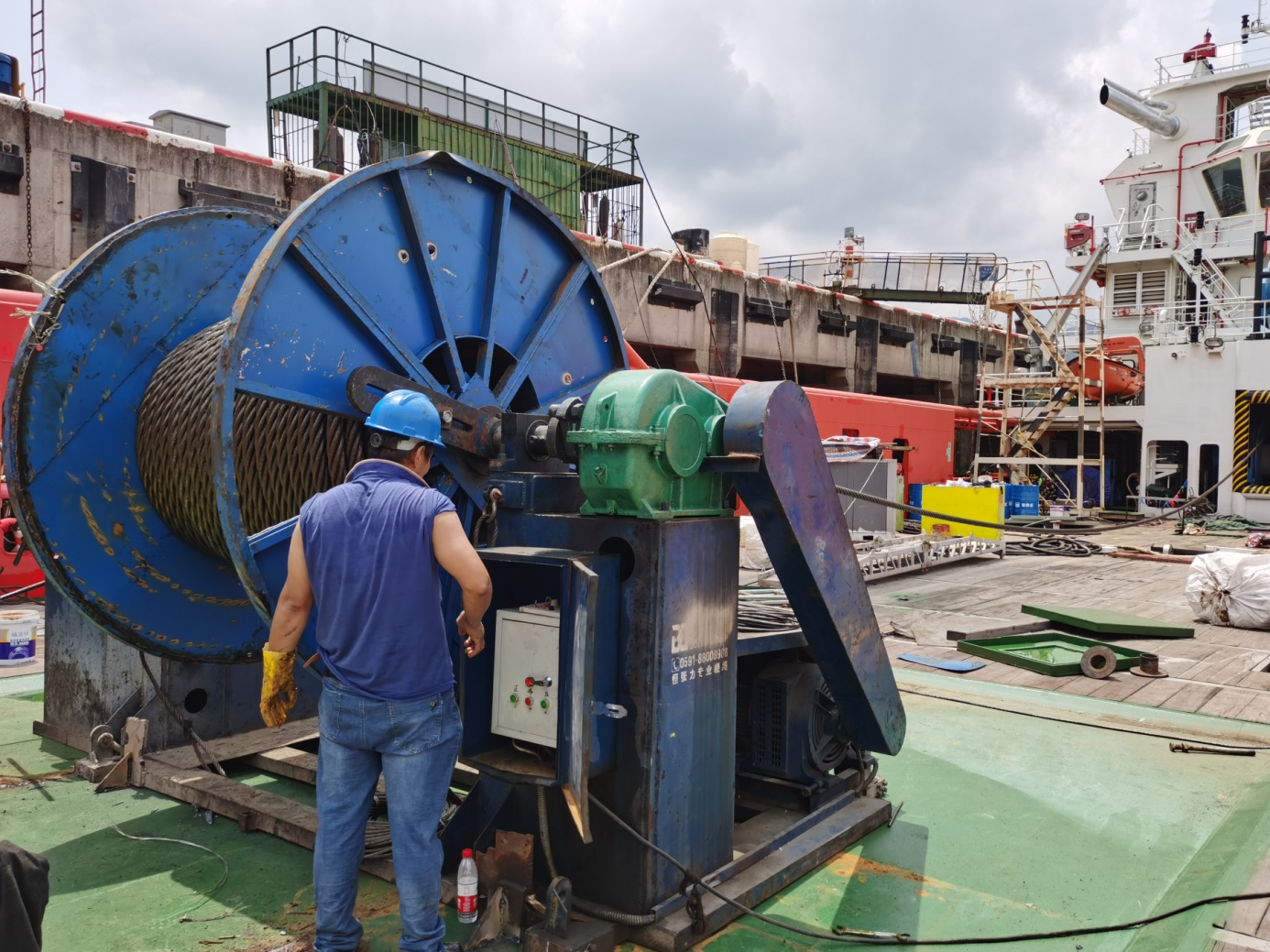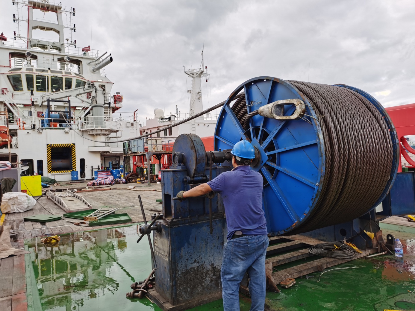現場查勘之后,廣鑫隨即組織安排經驗豐富的操作人員,爭分奪秒與時間賽跑,科學有序安排繞繩設備進場。本次作業(yè)因原主拖纜卷筒上鋼絲繩排列不良,外層鋼絲繩排列出現嚴重交錯現象,且伸長下垂,給導輪工作造成很大困難。憑借著豐富的經驗,我司技術人員克服種種困難,加班加點,終于按客戶的要求在8月19日晚上八點安全可靠地如約完成繞繩任務。