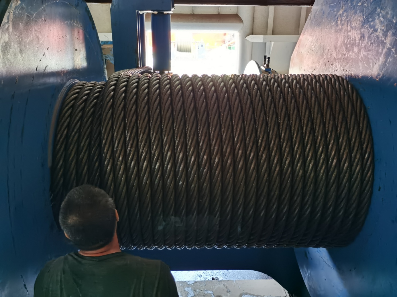 8月17日接某船廠客戶緊急需求,其拖輪需于8月20日出發(fā),并要求我司需在兩日內完成三次繞繩任務。接到任務后,廣鑫銷售團隊與技術團隊立即趕赴船廠,實地查勘并安排繞繩相關事項。本次任務,除了時間緊之外,其繞繩鋼絲繩長度長達1200米,單條鋼絲繩總質量超過19T,而且要求鋼絲繩必須在持續(xù)張力情況下繞進卷筒,因此對卷筒排繩也提出更高技術要求。