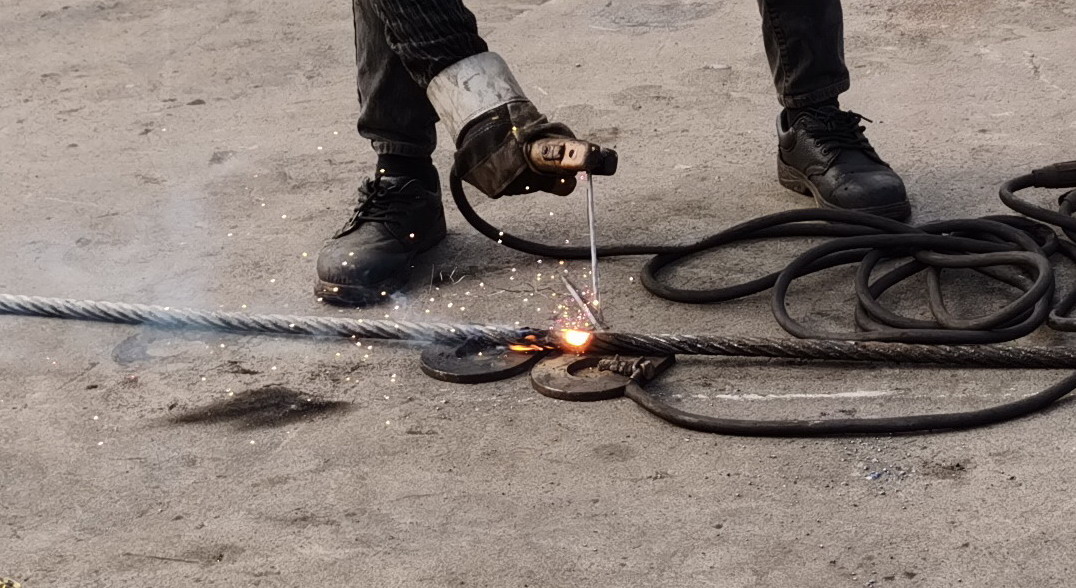 1) 使用舊繩牽引新繩安裝過程中,如果舊繩與新繩之間采用焊接等方式剛性連接(圖3),舊繩上殘留的部分扭轉(zhuǎn)應(yīng)力將傳遞到新繩上,可能引起扭轉(zhuǎn)應(yīng)力累積,最終造成吊鉤旋轉(zhuǎn)。