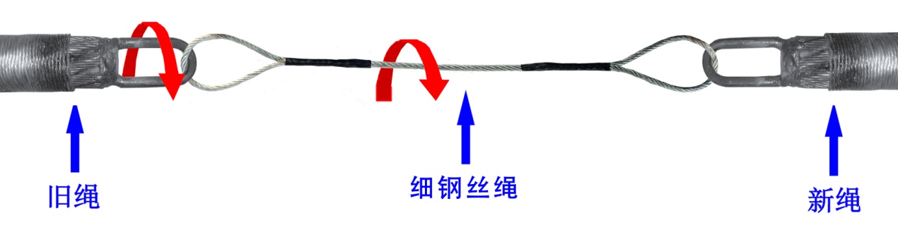 為了確保舊繩上殘留的扭轉(zhuǎn)應(yīng)力不會(huì)轉(zhuǎn)移到新繩上,可以通過使用輔助繩索吸收扭轉(zhuǎn)應(yīng)力,即在舊繩與新繩之間連接一根足夠強(qiáng)度的細(xì)鋼絲繩(圖4)。