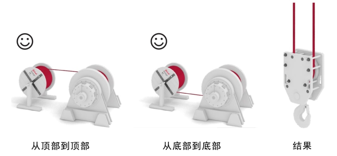 鋼絲繩從卷盤到卷筒正確的繞繩方式應(yīng)為正向彎曲進(jìn)入,即從頂部到頂部或從底部到底部的繞繩方式(圖6)。