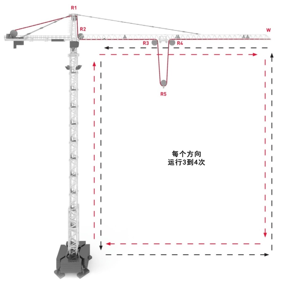 1. 操作塔吊小車與吊鉤運(yùn)行,如圖2所示,先按黑色虛線及箭頭方向循環(huán)操作3~4次,再按紅色虛線及箭頭方向循環(huán)操作3~4次,可以將鋼絲繩上部分扭轉(zhuǎn)應(yīng)力轉(zhuǎn)移至旋轉(zhuǎn)器(W)上,從而解決吊鉤旋轉(zhuǎn)問題。
