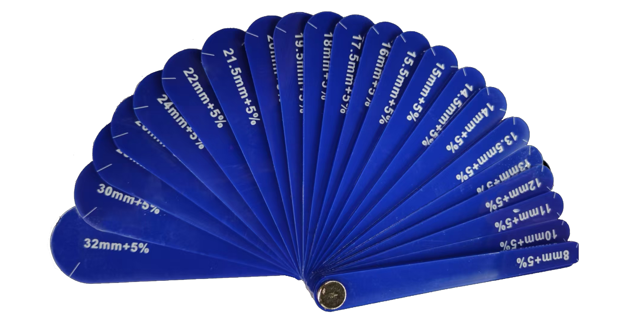 繩槽直徑應(yīng)用半徑規(guī)(R規(guī))或滑輪量具進(jìn)行測量(圖1),R規(guī)一端帶有各規(guī)格直徑的半圓形弧面,根據(jù)半圓形弧面與繩槽貼合狀態(tài),檢查與確認(rèn)繩槽是否符合標(biāo)準(zhǔn)要求。滑輪與卷筒繩槽直徑的檢測方法如下: