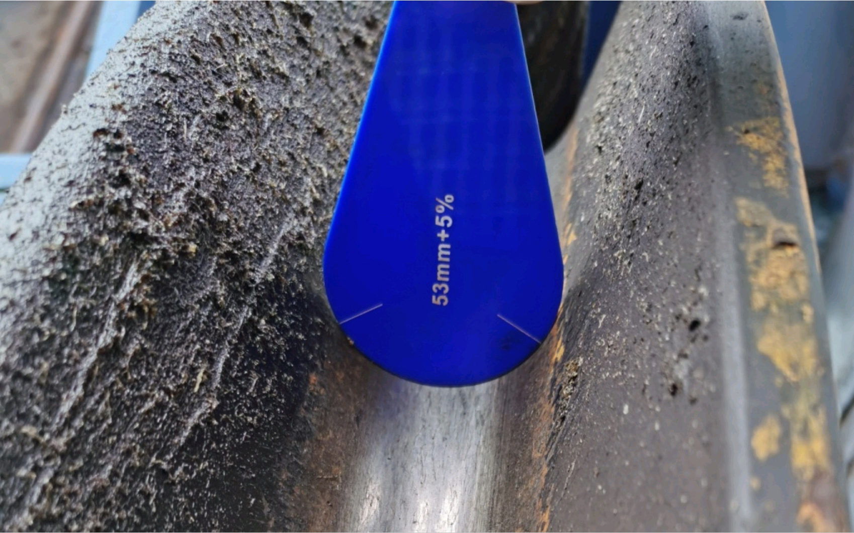 選擇與起重機(jī)用鋼絲繩公稱直徑符合的R規(guī)對繩槽進(jìn)行測量,R規(guī)測量時(shí)弧面應(yīng)貼合繩槽底部,并垂直于繩槽底部槽面。例如某卸船機(jī)設(shè)計(jì)使用的鋼絲繩公稱直徑為53mm,則選擇規(guī)格為53mm+5%(弧面直徑為53mm×1.05=55.65mm)的R規(guī)測量。圖2中R規(guī)半圓形部分上兩條白線范圍內(nèi)弧面正好與繩槽完全貼合,說明繩槽直徑正常,符合公稱直徑53mm的鋼絲繩使用要求。