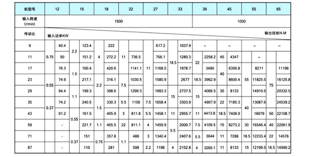 單劑擺線針輪減速機(jī)的傳動(dòng)比、輸出功率和輸出轉(zhuǎn)矩表