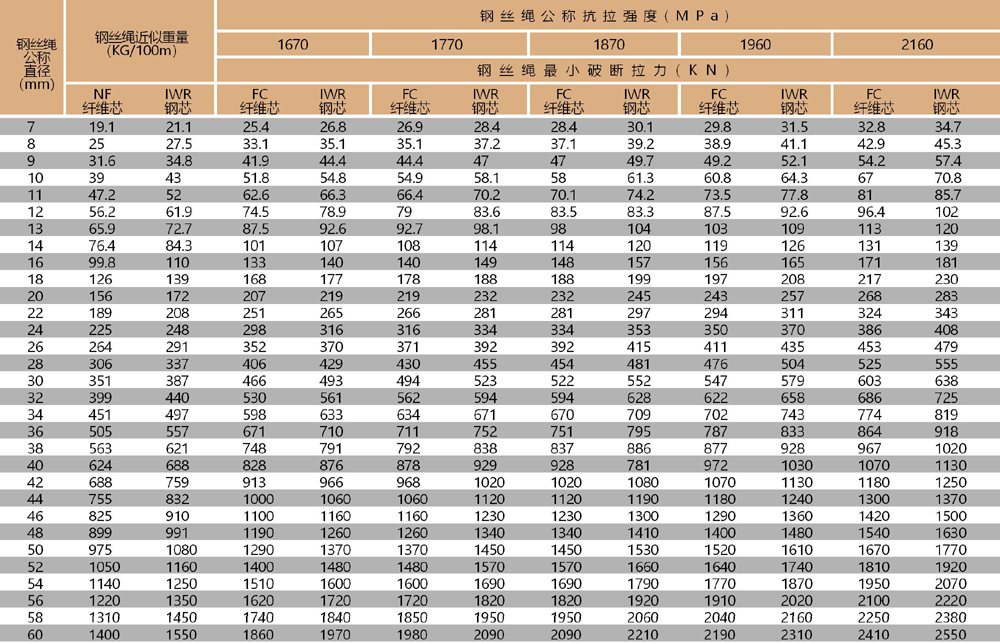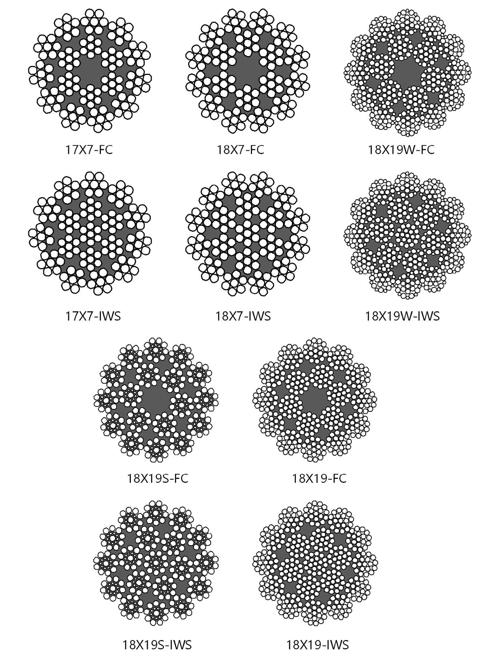 鋼絲繩結(jié)構(gòu):17X7-FC 17X7-IWS 18X7-FC 18X7-IWS 18X19W-FC 18X19W-IWS 18X19S-FC 18X19S-IWS 18X19-FC 18X19-IWS