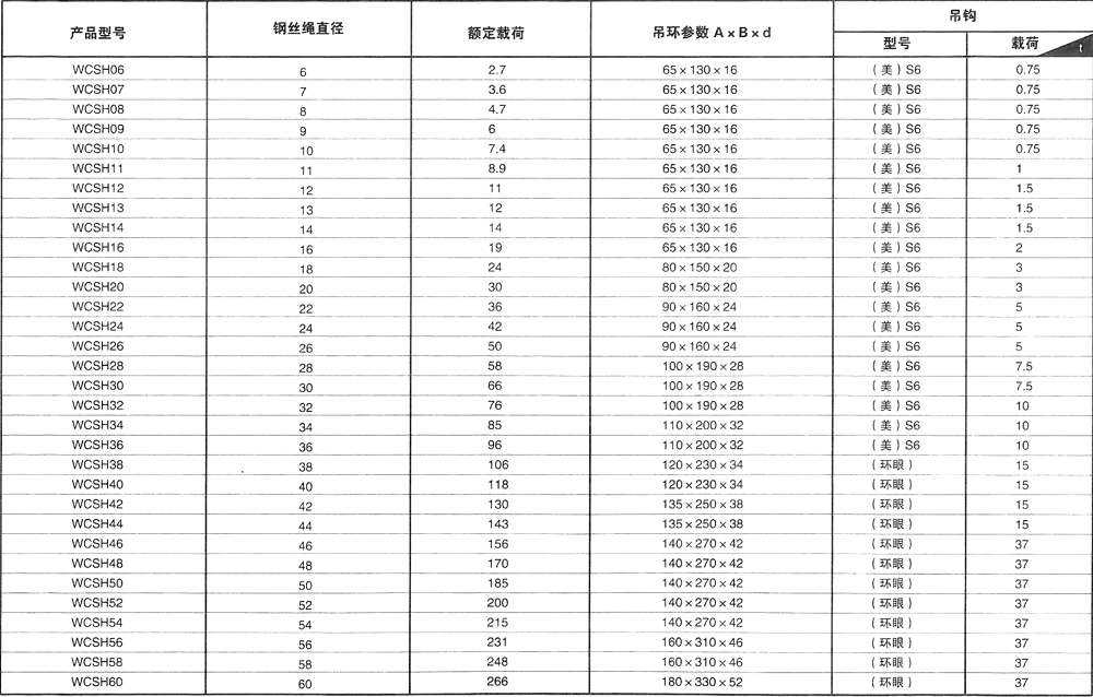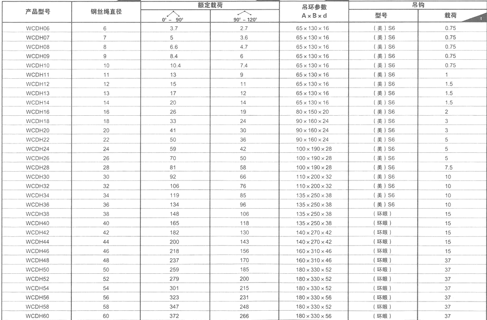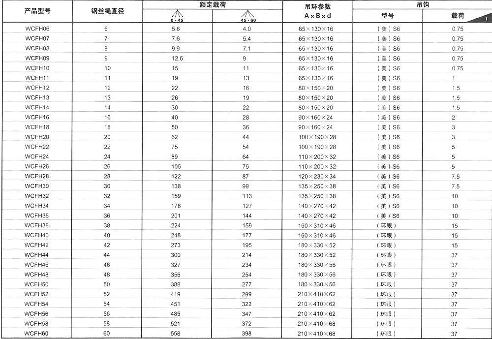 本表格工作載荷所用規(guī)格為:6X37+FC-1670