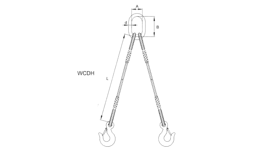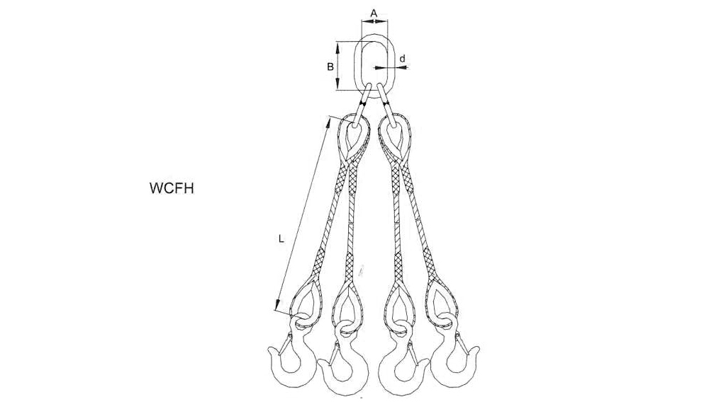 3、兩根鋼絲繩索具使用時,將兩根鋼絲繩索具直接掛入雙鉤內(nèi),兩根鋼絲繩索具各掛在雙鉤對稱受力中心位置;四根鋼絲繩索具使用時,每兩根鋼絲繩素具直接掛入雙鉤時,注意鉤內(nèi)兩根鋼絲繩索具不能產(chǎn)生重疊和相互擠壓,四根鋼絲繩索具要對稱于吊鉤受力中心,如圖: