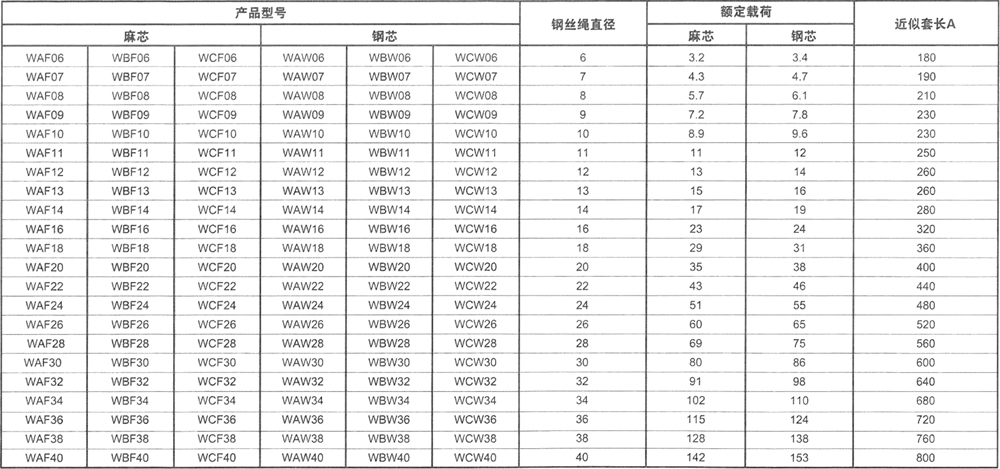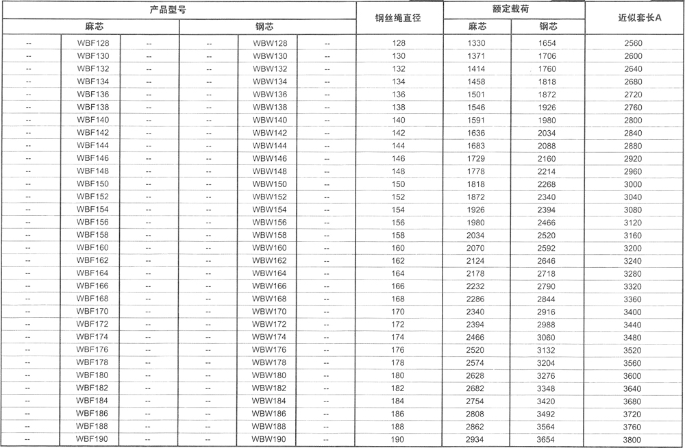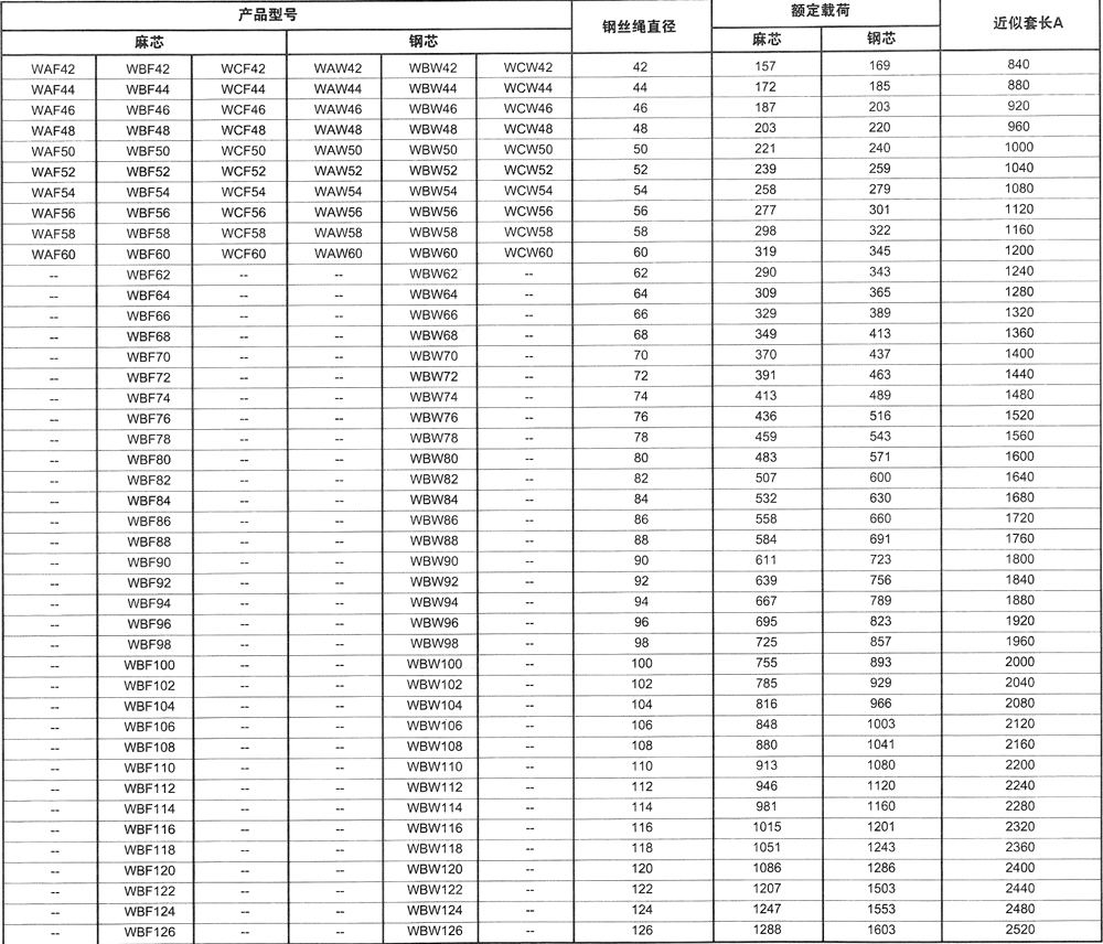 本表工作載荷所用鋼絲繩規(guī)格為:φ6~φ60采用6x37(b)-1670、:φ62~:φ120采用8x61(b)-1670、:φ122~:φ190采用8x91(ab)-1670;