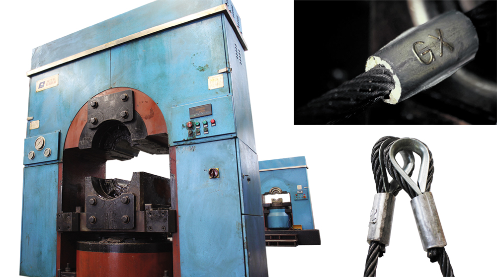 鋼絲繩壓制繩索工藝是一種先進(jìn)的鋼絲繩索具制作工藝,壓制的繩索外形美觀、精確度高、締結(jié)強(qiáng)度大,其接頭形式效能近似系數(shù)比插編繩索高20%,是國(guó)際最普及的索具形式之一。