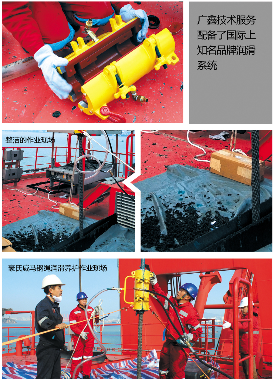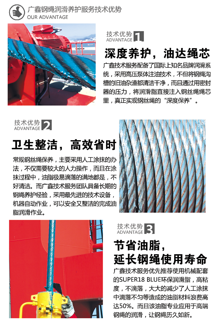 廣鑫技術(shù)服務(wù)配備了國際上知名品牌潤滑系統(tǒng),采用高壓泵體注油技術(shù),不但將鋼繩溝槽的舊油雜渣都清潔干凈,而且通過用密封器的壓力,將潤滑脂直接注入鋼絲繩繩芯里,真正實(shí)現(xiàn)鋼絲繩的“深度保養(yǎng)”