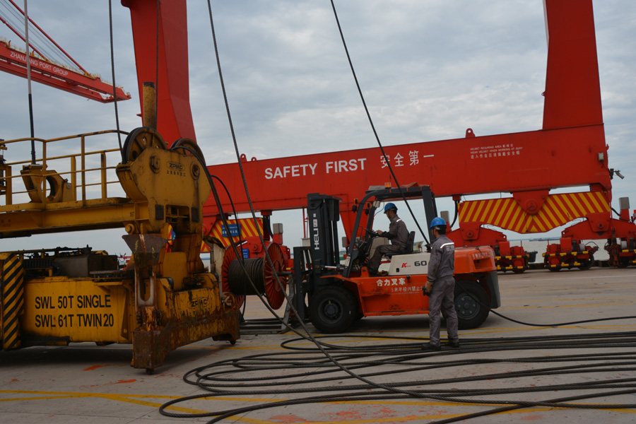 在碼頭面切斷新鋼絲繩,做頭,保持四鋼絲繩自由懸垂時(shí)長(zhǎng)度與舊繩一致。