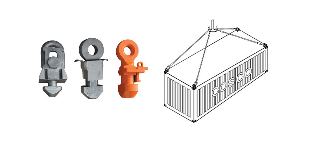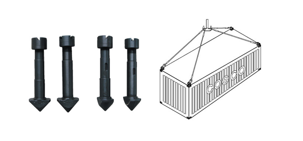 吊環(huán)式和插片式配上四根鋼絲繩即可成為一種最簡易的集裝箱吊具。嵌入集裝箱頂部的四個鎖孔內(nèi),手工旋轉(zhuǎn)90度,放下制鎖片即可起吊。