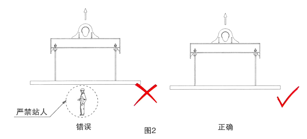4、吊具負載時,下面嚴禁站人(如圖2)。