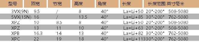 Logo: There are two types of narrow-cut V-belts, one is the base SP series, the models are XPZ, XPA, XPB, XPC; the other is the effective V series, the models are 3VX, 5VX, and the products are all based on the inner circumference of the V-belt Refer to the table above for the conversion length reference of the long machine.